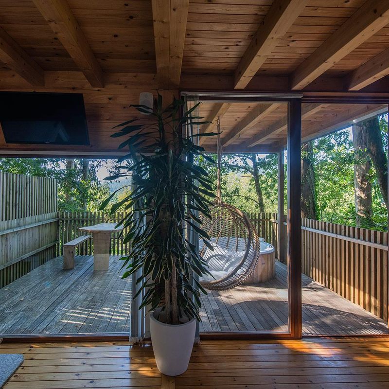 It provides the entrance to the estate and is located in its eastern zone, 6m high. The terrace is equipped with a swing and an outdoor jacuzzi, where you can enjoy a hot bath, with spectacular views towards the valley, the Tambre river, and a stand of native trees composed of pines, oaks, laurels, hollies, etc. Furthermore, it is fully accessible as it has ramp access.
